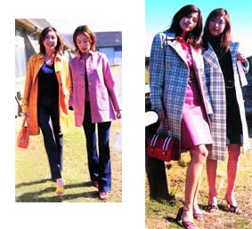 上左:柠檬黄格子风衣(左)配紫色V领T恤与黄色鞋子,衬托你大气洒脱的一面。粉色细格风衣(右)配深红色T恤,红色鞋子为整体形象增加了娴淑之美。