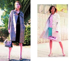 上右:花朵风衣浅色花朵风衣配浅粉色针织衫与浅蓝色短裙,如初春的雏菊一般散发清雅的芳香。