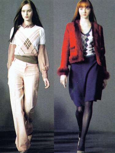 深浅对比虽烈、线条硬朗分明的菱形纹,一向是欧洲古典主义代表设计的宠爱图案,它本身已经具有视觉冲击性,加上设计师在式样和搭配上玩出的花样,自然更乱人眼。有序与无序、规则与破坏,对比的元素同时存在于整体设计中。好似一个出身名门、受过最正规传统教育的青年,离经叛道的惊人一面。