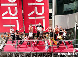 秋冬运动时装的模特,10月4日在香港尖沙咀美丽华商场外墙舞台上表演,展示优美姿态,为该品牌运动系列宣传。