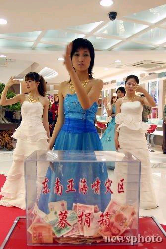 行内人头攒动,5名模特顶着低温走秀,为印度洋海啸(专题,图库)真情募捐。人们纷纷往募捐箱内献上一份心意,半个小时过去,现场已筹集3万多元。
