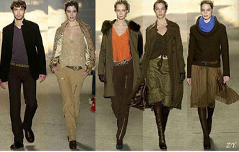 贴身的裤,不对称的剪裁是设计师Donna Karan的匠心独韵,有些想工作裤的风格陪着简洁明快的色彩,无论男女都掩饰不住青春的跳跃。中长的夹层外套,搭配上中长的裙,是休闲也是标新立异,仿佛看见秋日里,金黄落日铺垫的道路上摇逸的身影,远远地近了。