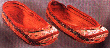 魏晋南北朝妇女的衫裙 魏晋南北朝时期,女子多穿履、靴等,有皮履、丝履、麻履、锦履等。凡娶妇之家先下丝鞋为礼。鞋子的形式有风头履、聚云履、五朵履;宋有重台履;梁有分梢履、立风履、笏头履、五色云霞履;陈有玉华飞头履;西晋又有鸠头履。有的以形式定名,有的以色饰定名。其中各种履不一定都是妇女所穿,如风头、立风、五色云霞、玉华飞头等属妇女所穿;重台履是厚底鞋,男女都有之,因为南北朝时男足女足无异样。 还有加以锈纹的履,例如陆机《织女怨》有“足蹑刺绣之履”;梁时沈约有“锦履并花纹”。另外木屐在当时也为妇女穿着。