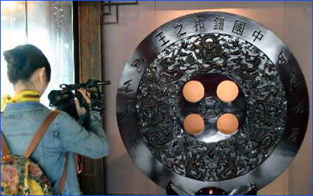 该图为一位旅客为“纽扣之王”摄像。浙江西塘镇有个纽扣博物馆,馆中有个世界最大的纽扣,该纽扣用泰国红木制成,直径1.8米,厚0.18米,重420.2公斤。西塘是中国纽扣之乡,有纽扣生产企业500余家,年产值高达十亿元人民币。