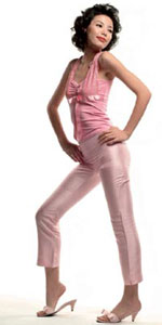左:弹性极高的莱卡面料,配上迷人性感的蕾丝,不仅穿起来舒适合体,更能将凹凸有致的曲线包裹得天衣无缝。粉色上衣 MD 539元,真丝九分裤MISSK 480元,粉色凉鞋 真美诗 628元。