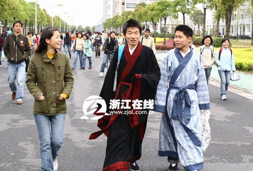 长袍宽袖,出入公共场合,与身穿现代流行服装的普通人和平共处——这就是汉服一族。最近杭州街头频频出现汉服一族,据了解大多是“杭州汉服群”中的网友。汉服一族大多将这种服装作为一种中华民族古文化来对待,对汉服有着深厚的感情,他们的汉服也由资深网友自己制作。