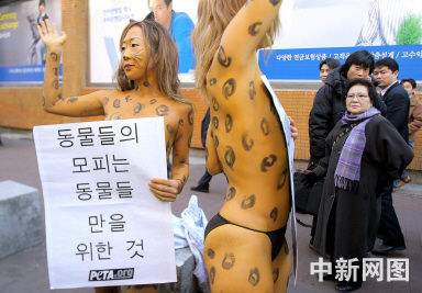 近日动物保护主义者在韩国汉城举行示威活动,示威女子只穿着内衣并在身上涂上豹纹斑点彩绘,手中打出“