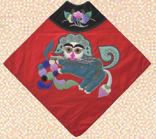以绣工与立体缀饰结合,是一大特色;嵌以银丝线,更显华贵;狮子的形象也富有童趣,简约生动。
