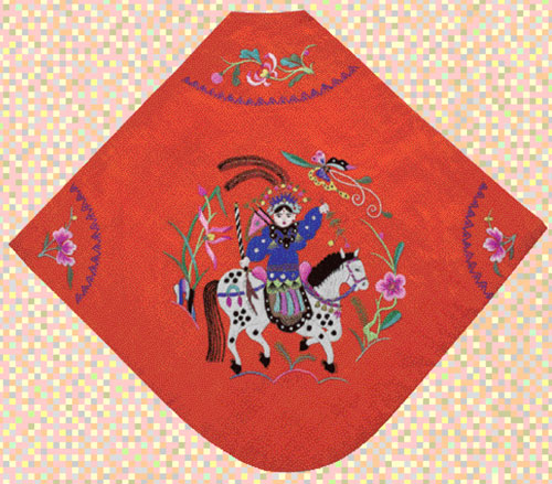 头戴”七星额子”插狐尾及”靠旗”,形象地展示出女将的英武和阴柔之美。花蝶作陪衬而显得一派春色。