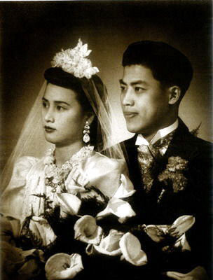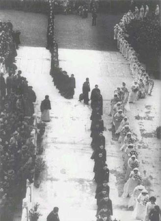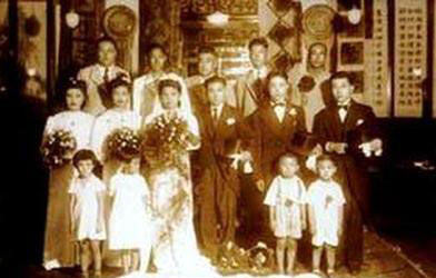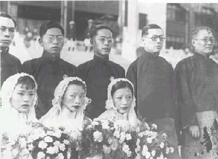 在上海等大城市开始流行穿白色婚纱礼服,一般新娘穿白色婚纱礼服,手捧鲜花,头戴白色长纱,长达五六米,新郎穿黑色大礼服,白硬领衬衫,戴黑领结,手捧黑呢高帽和白色手套,另外还有男女二位傧相,也穿大礼服和白纱,陪着一对新人,举行婚礼后就在教堂内与双方家长,证婚人等拍摄合影照,这就是起初的婚纱照,这种类型的结婚照一直延续到50年代。
