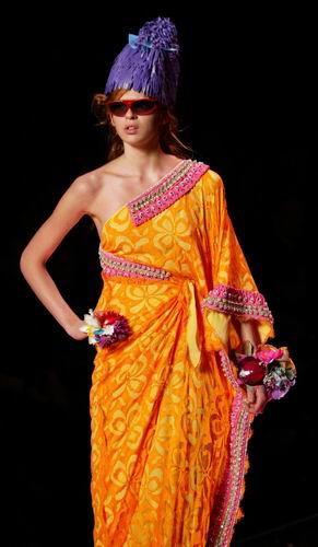 当然,Galliano一向擅长的复杂混搭风格依旧不可能缺席:充满趣味、新鲜感十足的配饰,展现俗佣的80风格、夸张的眼镜、小孩充气玩具般的朔胶帽饰、圆豆荚状的假花朵绣饰与颈炼、成串垂坠的金币编织帽饰、跟秀场主题成为非常矛盾的比对。不过绝对让人期待的压轴晚宴服系列,果不期然的优雅炫丽、混杂的鲜丽迷幻图样;整场剧场形式的浓烈彩妆,也算是呼应了Galliano在新一季的野心和期望。