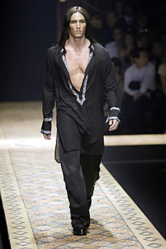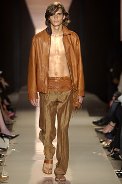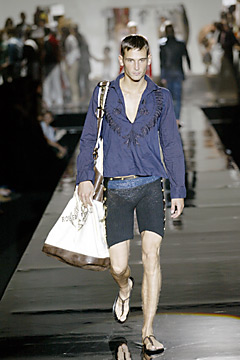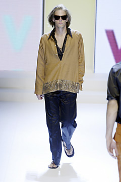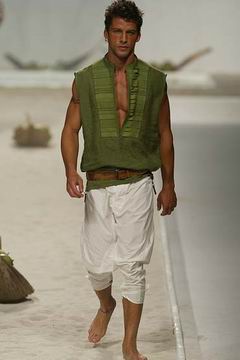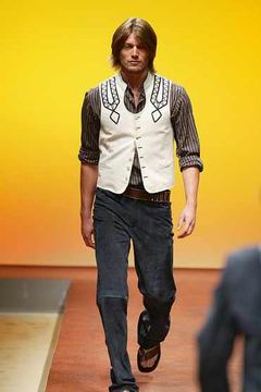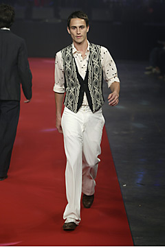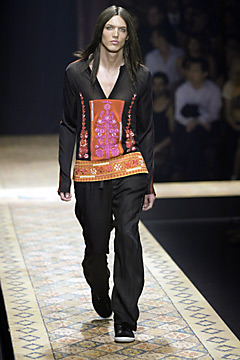 2004春夏男装周举行的当下,时值中东局势的不安,美伊战争似乎一触即发, 因此也让时尚界从中撷取灵感,透过设计师的巧手,表达对一种战争的批判或是追崇自由、和平的热情,让异族民俗风的热潮顿时炒热了起来,成为春夏的另一主流。