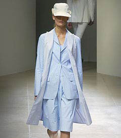 自从90年代几位极简派设计名家Helmut Lang、 Miuccia Prada 和 Sander造成一股风潮后,这种服装款式便受到特定时尚族群的莫名偏爱;以充满南欧度假心情的希腊ikat岛为灵感,本季jil sander的风格依旧,却添加了不同的色调、雅致的缀饰、古典瑰丽的打折处理、和奢华质感的布料、摒弃抽像递解构概念、让都会女性的气质产生出不一样的变化;透过点缀的黄铜色纽扣、冷调的咖啡褐/淡灰/纯白/淡天蓝/卡其色和紫罗蓝色/孔雀蓝/绿松石色等单纯的色调、将男式衬衫立体的皱折线条、素雅的A字裙、以及薄纱裙摆、小腰身夹克整合建构出自然流畅的别致风情。