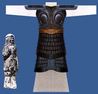 南北朝时期明光铠 魏晋北朝时期的铠甲主要有筩袖铠两、裆铠和明光铠。“明光铠”一词的来源,据说与胸前和背后的圆护有关。因为这种圆护大多以铜铁等金属制成,并且打磨的极光,颇似镜子。在战场上穿明光铠,由于太阳的照射,将会发出耀眼的“明光”,故名。这种铠甲的样式很多,而且繁简不一:有的只是在裲裆的基础上前后各加两块圆护,有的则装有护肩、护膝,复杂的还有数重护肩。身甲大多长至臀部,腰间用皮带系束。左面陶俑是戴兜鍪、穿明光铠的武将;右面是明光铠穿戴展示图。