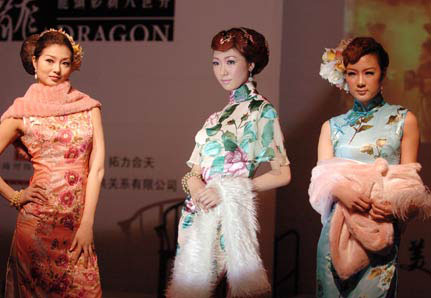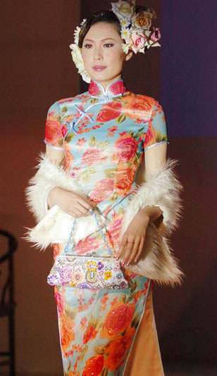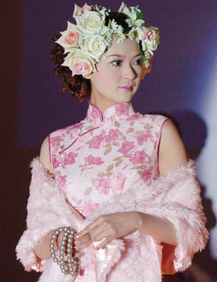 沈阳,2005年3月19日妩媚婚纱时装秀. 3月19日,一位模特在展示具有中国传统特色的婚纱礼服。沈阳龙摄影新人世界在当日举办的婚情博览会上推出数款具有中国传统特色的婚纱礼服,妩媚动人,吸引了许多新人关注。