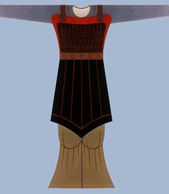 魏晋南北朝两裆铠 魏晋北朝时期的铠甲主要有筩袖铠两、裆铠和明光铠。 “裲裆”,有两种含意,一种是指服饰制度中的“裲裆衫”;一种是指武士穿的“两裆铠”。两者的外形大体相同,区别主要在质料上。裲裆衫的材料,通常用布帛,中间纳有丝棉,取其保暖。而裲裆铠的材料则大多采用坚硬的金属和皮革。铠甲的甲片,有长条形和鱼鳞形两种,比较常见的则是在胸背部分采用小型的鱼鳞甲片,以便于俯仰活动。为了防止金属甲片磨损肌肤,武士在穿着两裆铠时,里面还常衬有一件厚实的裲裆衫。图为两裆铠穿戴展示图(根据出土砖刻、陶俑、壁画复原绘制)。