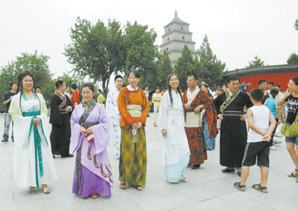来自西安不同行业的8名网友相聚在大雁塔北广场,上演了一场“汉唐服饰秀”。据本次活动的服装设计师介绍,本次活动的所有男士穿的都是汉朝贵族常服,4位女性中有穿唐朝服饰的,也有穿汉代服饰的。