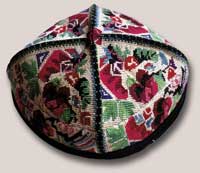 多彩的帽饰与鞋靴维吾尔花帽不仅选料精良,且工艺精堪,制作小花帽的维吾尔工匠,都有一套“绝活”。花帽的图案与纹样千变万化,各不相同花帽的样式、花纹与图案也与各地域环境的有关,各地的花帽,都具有明显的地方特色。喀什地区花帽样式繁多,尤以男花帽显著,那种以黑底白花纹为主,色彩对比强烈、格调典雅的“巴旦木”图案,按纹饰的线构成的,凌角突起而显出立体感,却把黑白色深印在人们的脑海中。和田、库车地区的花帽则以优质的丝绒面料,又配色彩各异的丝绒编织纹样,疏密有致的穿插,致使纹样透溢出独特韵味。有的花帽镶饰串珠、金银饰片,珠饰圆润光泽,巧妙地运用图案本身结构的因素,使花帽繁花似锦。还有的花帽顶部纹饰凸起,彩线编织细腻,彩球串缀闪亮夺目,是新娘的喜爱之物。吐鲁番地区的花帽则以色彩艳丽著称,那大红的花纹配上翠绿的花纹,宛如朵朵绚丽的奇葩。伊犁地区的花帽,不仅突出线纹的流动感,它的特色具有素雅、大方的优点,花帽造型扁浅圆巧,纹样简炼概括。