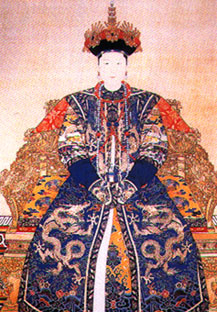 清代皇后服饰 皇后的朝服由朝冠、朝袍、朝褂、朝裙及朝珠等组成。朝冠,冬用薰貂,夏用青绒,上缀有红色帽纬。顶部分三层,叠三层金凤,金凤之间各贯东珠一只。帽纬上有金凤和宝珠。冠后饰金翟一只,翟尾垂五行珍珠,共三百二十颗,每行另饰青金石、东珠等宝石,末端还缀有珊瑚。朝袍以明黄色缎子制成,分冬夏两类,冬季另加貂缘。朝袍的基本款式是由披领、护肩与袍身组成。披领也绣龙纹。朝褂是穿在朝袍之外的服饰,其样式为对襟、无领、无袖,形似背心。上面也绣有龙云及八宝平水等纹样。本图为戴朝冠、穿朝服、朝褂的皇后(《清代皇后像》)。