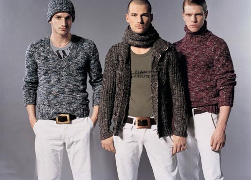 豪情满怀的男性气慨并不等同于体格剽悍、举止粗鲁、一味夸张自己的男性特征。如今影视剧中的当红男星,莱昂纳多、木村拓哉、金城武……都不是肢体异常发达的肌肉情人,他们之所以成为这一季人气指数极高的超级偶像,正是由于其浑身上下举手投足间透射出自由、俊逸、无畏的鲜活气息和清洌神秘的叛逆韵味,微妙地触动了新新人类们那最易感动的心弦。力量并不来自肉体,而来自精神,服饰便顺理成章地成为这种力量忠实的外化与延伸。以一件皮背心、一条大号裤,配一根荧光领带,或一身粗糙的粗布牛仔、一双懒汉式便鞋,配一款钢带手表,好像彻夜不归人那样,与传统好男人形象也许大相径庭,但更富有叭我的美感与率性飞扬和时代气质。