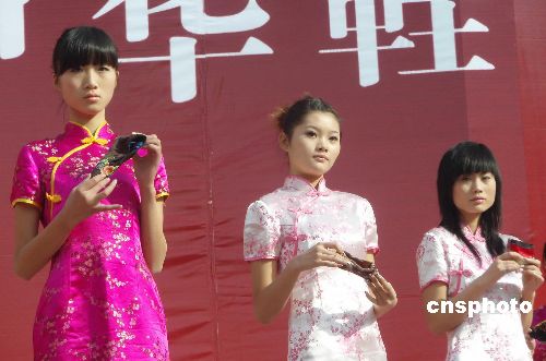 模特正在展示中国古代的“三寸金莲”(小脚鞋)。