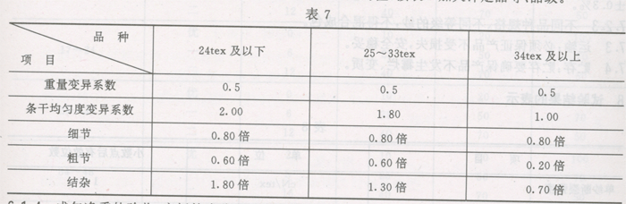 6.1.3验收检验必须是同品种、同规格、同一交货批,并限于收货方未使用过的产品。其纱的重量变异系数、条干均匀度变异系数、细节、粗节、结杂根据标准规定的值,按表7加大评定品等、品级。