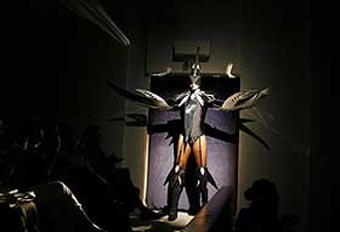 其他的设计非常离奇——比如象Michel Mirabal的设计,他的设计灵感来自H. Upman品牌。展示Mirabal设计的服装的模特炫耀着头上的茶杯与茶托,还有奢华的长袍下象怀孕一样的大肚子,而在肚子上,有一个缝上去的肚脐。