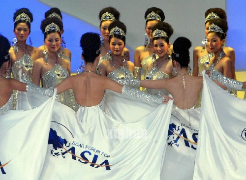4月24日,中国新丝路模特经纪有限公司的模特们在博鳌亚洲论坛2004年年会期间举办的亚洲文化晚会上表演。在海南博鳌亚洲论坛2004年年会上,来自中国、巴基斯坦、泰国等国家的时装设计师在博鳌举行的亚洲文化晚会上与中国的时装模特合作展示他们的最新时装作品。这些时装兼备了亚洲国家历史文化气息和当今国际缤纷时尚趋势,为博鳌亚洲论坛年会增添亮丽风景。