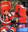 土族服饰的特点是鲜艳。土族妇女通常的装束是身穿斜襟上衣,两条袖子是用红、黄、绿、紫、蓝五色彩布圈缝制成的,远看,如同两道美丽的彩虹。每逢喜庆节日,能歌善舞的土族青年男女,都会身着艳丽的民族服装,犹如山花一般,把庭院、山乡点缀得五彩缤纷。