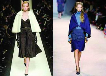 Nina ricci的设计师则将披肩外套化,披肩的下摆演化成两只宽袖,优雅的披肩此刻显出一种干练之美。柔媚的蓝色则不失时机地赋予披肩以温柔的女性气质。如此装束十分适合在曼哈顿工作的职场女性。