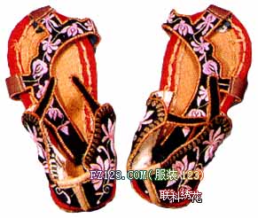 绣花鞋是我国少数民族妇女经常穿用并十分喜爱的一种鞋子,一般用布和锻了做成,用丝线锈上各种适合纹样,有花卉、蜂蝶、禽鸟或其它几何图案。绣花鞋是我国少数民族妇女心灵手巧的象征,是她们的审美追求和审美情趣的生动表现 。