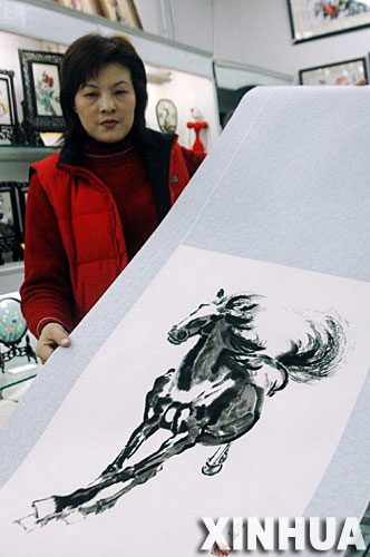 12月6日,在济南一家刺绣品店里,工作人员展示一幅“发丝绣”作品。