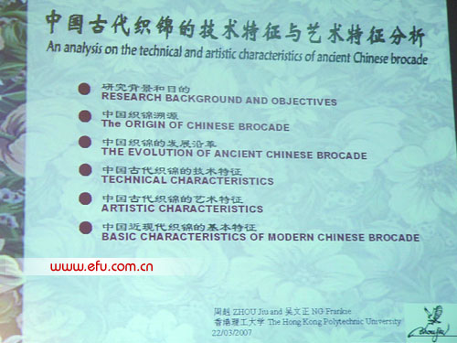 2007年3月22日,来自香港理工大学的吴文正教授,带来了中国古代织锦的技术特征和艺术特征分析报告会。