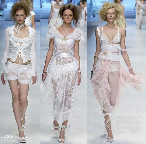 马克·雅各布关于今年秋季服装的设计思想之一就是叠层设计。他用蕾丝或网状织物罩在一件开士米材质的厚纤维服装上,形成织物包织物的层次。而从中演化出来的分层式春装在布莱恩·瑞斯、奥斯卡·戴拉·瑞塔和男装设计师瑟姆·布朗尼的作品中都有体现。瑟姆·布朗尼把一层棉质薄纱或带斑点的透明织物套在灰色或白色的传统羊毛夹克之外,相当于是给厚衣服套上了“面纱”。布朗尼说:“这可以提醒人们,这是个浪漫的世界,这个世界崭新而美好。”