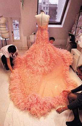 这套粉红色高级订制服所有的素材包括了140公尺的绢纱、10公尺的乌干纱、10公尺的乔琪纱、250根鸵鸟羽毛,以及超过3,000颗的银色水晶。
