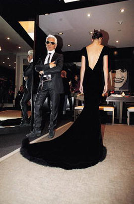 Lagerfeld从草图开始全程参与这两套订制服的设计制造过程,并决定要将重要的道具:No.5钻石项链垂挂在妮可的背面,如此一来,以深V线条露背剪裁,最能衬托珠宝质感与光彩的黑色丝绒材质,以及拖曳、滑动在红地毯阶梯上的裙襬曲线效果,便成为这套订制服设计上最重要的元素。光是抓出1公尺的钻石项链与V形线条、妮可若隐若现的性感背脊间最完美的比例,而达到Lagerfeld与Luhrmann还有妮可的要求,工作坊员工、妮可、Lagerfeld在伦敦试装,并透过视讯会议的方式,与远距外的Luhrmann一起工作,尝试过3次以上的剪裁线条,才算达到所有人的完美标准。