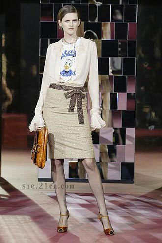 说的简单些,有霸气的女人味,似乎就是女装整体的精神主轴,例如采用朴实材质与正经的材质,去对蕾丝与珠宝的女性气味,或者在中性的成套裤装打扮中,于内部搭上蕾丝背心,或者配佐一件夸大蝴蝶结的白色衬衫,来诠演刚柔并济的中性路线。不过精采的还不仅如此,陪伴大家一路成长的迪士尼卡通人物,包括米老鼠、米妮、唐老鸭图案的T恤,也有着吃重角色,增添了些许顽皮气味。