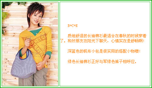 上左图:B+D+E 多层次的穿着一定要注重颜色的选择,否则会有头重脚轻的感觉。