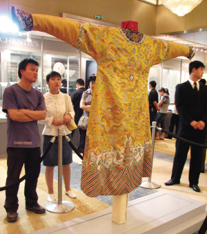 一件极尽奢华精美的乾隆皇帝龙袍、一对清雍正粉彩过枝福寿双全碗、清乾隆粉彩花蝶纹如意耳葫芦尊、一对稀有的清乾隆粉彩松绿地镂空山水四方螭耳式香熏……这些过去皇宫里的用品,近日在佳士得香港2007春季拍卖会北京预展中亮相,吸引了京城收藏爱好者前来观看。
