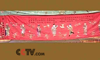 藏品特征:这件藏品横410厘米,纵130厘米,在大红色的绸子上边绣着八个人物形象,每个人手里都托着一件宝物。从左至右,第一人手里托着珊瑚,第二人托着珍珠,第三人托着一盘珠宝,第四人托着一匣书,第五人手里托举着一只如意,第六个人捧着一座钟,第七个人捧着一盘元宝,第八个人托着一只象牙。藏品右侧和上方的黑绒贴字有许多都已经脱落了。 相关背景资料:据文献记载,我国刺绣的起源大约开始于虞舜时代。数千年来,各类民间刺绣工艺几乎遍及全国。大至绣幛、绣被,小至绣花荷包和刺绣挂件等等。这些常用的工艺品和装饰陈设品,形成了一个纷繁的艺术世界。用作祝贺或吊唁礼物的幛子,通常是用整幅的绸布,上面绣着祝贺或者是哀悼的词句。简单的,几个字就可以,精致的,则要配上一篇华美的幛词和吉祥精美的图案纹样。这种幛子又被称作贺幛、礼幛。祝寿用的幛子则称为寿幛。这幅绣着精美的“百子图”的幛子,则是用于庆贺孩子出生时使用的。唐朝诗人胡令能曾经写过一首千百年来广为流传,脍炙人口的诗,"日暮堂前花蕊娇,争拈小笔上床描。绣成安向小园里,引得黄莺下柳条。"生动地描写和赞美了民间刺绣工艺品的精美。