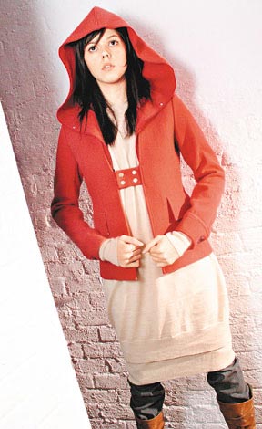 SlantWise橙红色TwinSet,由绒外套及同色连帽绒背心组成,底层再衬杏色有褶长身冷上衣