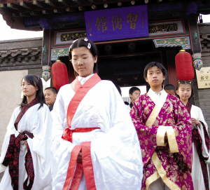 5月19日,孩子们身着汉服在山东邹城孟府习儒馆参加修学活动。 当日,来自孔子故里山东曲阜市的30余名少年在孟子故里邹城市进行修学活动,学儒习礼,感受传统文化的魅力。