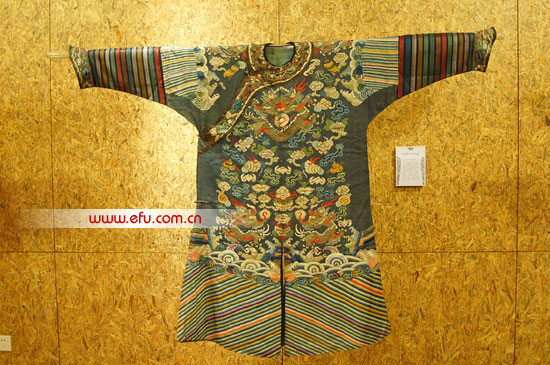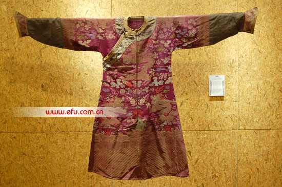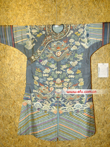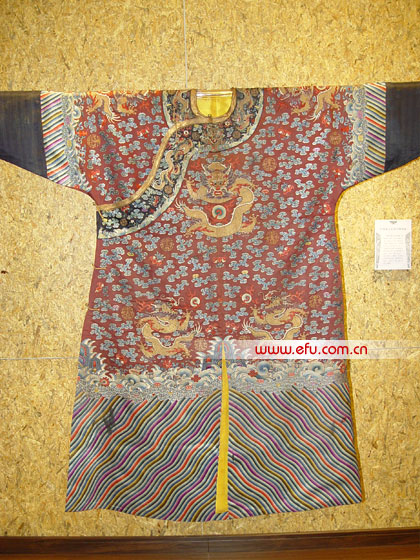圆领大襟,窄身箭袖,两侧开衩,衣长137cm,胸宽58cm,下摆宽97cm,袖通长200cm,接袖长30.5cm,开衩长29cm。袍身织有五爪金龙九条,前后两肩饰正龙各一,前后下摆处行龙各二,底襟处行龙一,间以五彩云、仙鹤、杂宝纹,下幅海水江岸纹。箭袖另有行龙各二。领口、大襟、袖口处有织金锦缘饰。