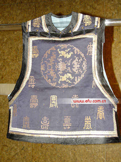 圆领大襟,宽身箭袖,前后开衩,衣长138cm胸宽74cm,下摆宽108cm,袖通长180cm,接袖长33.5m,前后开衩长54cm。袍身缂有五爪龙纹九条,前后两肩饰正龙各一,前后下摆处行龙各二,底襟处行龙一,间以五彩云、蝙蝠、杂宝纹,下幅海水江崖纹。箭袖另有正龙各一。领口有黑缎滚边,大襟、袖口处有织金缘饰。 (部分图为王阳摄)