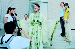 瞿秋石是大连大学人文学院二年级的学生,家住安徽合肥,父母都是工人。她从小热爱中国古典文学,常常迷醉在中华传统文化的浩瀚书海中。最初萌发要通过展示汉服来弘扬中华传统文化精粹的念头是缘于去年夏季媒体上的一则报道。当时有人穿着宽袍大袖的古典汉服走上街头,一家媒体的记者想当然地写道,殡葬服装的改变可能会带动殡葬经济的升温云云。瞿秋石的内心被深深刺痛,“这不是一家媒体记者的无知,而是近些年来人们远离传统文化的必然现象。”衣冠服饰是民族文化的外在特质,当一个民族的后人连自己祖先穿的衣服是什么样子都不知道的时候,这个民族的进步和发展将会被许多深层次的困惑所羁绊。瞿秋石认为,汉服是汉族人的传统服饰,凝结了华夏文化的诸多精粹。瞿秋石准备用实际行动援助那个被误认为穿着殡葬服上街的勇敢者,她立誓要穿着古典汉服闯进当代人的视野,盼望借此唤起人们对于自己祖先的崇敬。