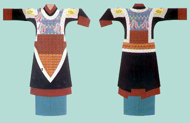 秦代铠甲 秦代将士铠甲图。秦代出土的兵俑分为军俑、军吏俑、骑士俑、射手俑、步兵俑驭手俑积累,他们的铠甲服饰装束表现出森严的等级制度。铠甲按形制分为四形,其四形为护胸腹形、铠甲形、骑兵步兵甲、驭手专用甲等四类。本图为胸腹形,这种铠甲形制比较特殊,只有胸腹部分有甲片,甲片周围有一道宽边。肩部和背部都无甲片,背后用交叉斜带与身前甲衣系结相连。带面上还残留有彩色的图案花纹,似乎是一种低级官员的装束。
