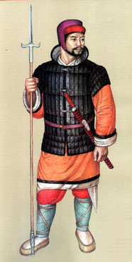 秦汉服饰 西汉时期,铁制铠甲开始普及,并逐渐曾为军中主要装备,这种铁甲当时称为“玄甲”。西代戎服在整体上有很多方面与秦代相似,军队中不分尊卑都穿禅衣,下穿裤。禅衣为深衣制。汉代戎服的颜色为赤、绛等都属红色。本图即为西汉骑士军戎服饰复原图。