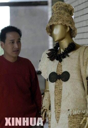 9月12日,一位男士正仔细观看奇特的树皮服饰。