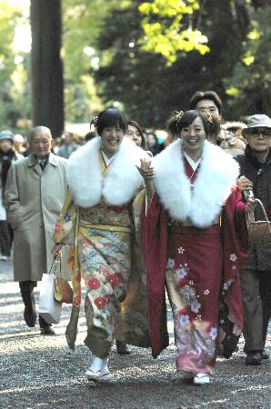 1月1日,在日本首都东京,两个身穿和服的日本女青年走向神社祈福