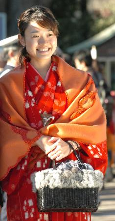 1月1日,在日本首都东京,一位穿着和服的日本女青年走在街头